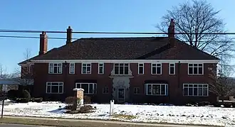 The Robert and Julia Darling House stands in the town center of Simsbury, on the east side of Hopmeadow Street, its principal thorough fare. It is just north of the Drake Hill shopping center, which stands on land formerly part of the Darling estate. It is a large two-story brick building, with a hip roof and a brownstone foundation. A two-story ell projects to the rear from its northeastern corner. The building exhibits basic symmetry in the Colonial Revival style, and has finely detailed entrances on the front-facing west, south, and in the corner created by the ell, which features a curved pavilion and porte-cochere. The interior, although it has been repurposed for office use, retains most of its original period woodwork.[2]