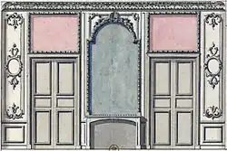 Born in Paris, Robert de Cotte began his career as a contractor for masonry, working on important royal projects between 1682 and 1685, when he was made a member of the Académie royale d'architecture and architect of the Court, ranking third in importance after Mansart's seldom-credited assistant François Dorbay.[3] On his return to France after a six-month sojourn in Italy (1689–1690), in the company of Jacques Gabriel,[4] he became the director of the Manufacture des Gobelins, where not only the famous tapestries, but also royal furnishings were produced; even designs made under his direction for wrought iron balustrading are to be found among the eight volumes of drawings for the Gobelins, and for other public and private commissions, conserved at the Cabinet des Estampes, Bibliothèque Nationale.[5] In 1699, when Mansart was made Surintendant des Bâtiments, a position otherwise invariably reserved for a noble layman, de Cotte became his second-in-command in an executive function, charged with overseeing all the files of drawings, the stocks of marble and other materials including those for the royal manufactures of the Gobelins and Savonnerie, with overseeing the bidding process with contractors and with liaison with the Académie, of which he was made a member that same year. Fiske Kimball, the chronicler of the Rococo, notes that there are no surviving drawings by de Cotte from this period, nor from the period after Mansart's death in May 1708.[6]