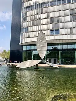 In 2001, Cordone designed a large-scale, outdoor monumental sculpture Movimento Ellissoidale, which stands in shallow water in front of the ARAG Tower in Düsseldorf.[10] Made from an alloy of aluminum and titanium, its high sail-like vertical form creates a five-ton wind-kinetic sculpture. An offset center of gravity, with an "inner pivot and self-aligning bearings, as used in shafts driven by a ship’s propeller, allows the large sculpture to maneuver freely like a sailing ship.”[11] Whether large gusts or gentle winds, the sculpture nautically corrects “in the wind."[11]