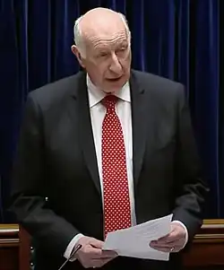 First Minister and DUP leader Peter Robinson announced on 22 June 2009 that Robin Newton would replace Jeffrey Donaldson as junior minister in the Office of the First Minister and deputy First Minister at the beginning of the new assembly term in September 2009.[8] This reshuffle took place due to Robinson's plans to phase out "double jobbing" amongst elected representatives. Newton was sworn in as junior minister by the speaker, William Hay, on 1 July 2009, and served until 16 May 2011. From 2011 until 2012, he was a Political Member of the Northern Ireland Policing Board.[9]