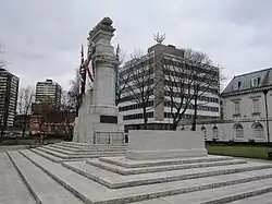 The memorial was constructed by Hobson Limited of Nottingham. While many First World War memorials feature sculpture or overt religious symbolism, Rochdale's, like many of Lutyens' memorials, uses abstract and ecumenical shapes inspired by classical architecture.[6][7] It comprises two elements: a 10-metre (33 ft) pylon and a Stone of Remembrance formed from light grey Cornish granite which are raised on a platform (stylobate) of three steps. The cenotaph is raised on six steps on the platform, and rises in diminishing tiers of broadly rectangular cross section, with its long axis oriented southeast to northwest. On the plain first tier are four carved and painted stone flags with gilt bronze poles, two to either side: the Union Flag and the White Ensign on the southwest side, and the Royal Air Force Ensign and the Red Ensign on the northeast. The flags flank a second, smaller, tier which has a semi-column at either end and which culminates in a smaller plinth supporting a catafalque. At the top is a sculpture of a recumbent soldier draped with his coat. The design for the pylon is based on Lutyens' Midland Railway War Memorial, unveiled in Derby in 1921.[1][4][8] Painted stone flags are a recurring feature in Lutyens' war memorial designs. He first proposed them for Whitehall's Cenotaph, where they were rejected in favour of fabric flags, but they appear on several of his other memorials including Northampton War Memorial and Leicester's Arch of Remembrance.[9]