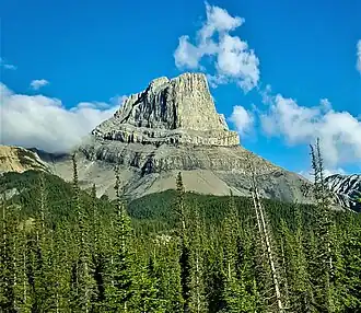 Roche Miette (/rɒʃ maɪˈɛt/) is a 2,316-metre (7,598-foot) mountain at the northwestern tip of the Miette Range in Jasper National Park, in the Canadian Rockies of Alberta, Canada. The peak is a prominent landmark in the Athabasca Valley that is situated approximately thirty kilometres north-northeast of the municipality of Jasper, and four kilometres northeast of the Jasper House National Historic Site. It is visible from Highway 16 and the Canadian. Its nearest higher peak is Capitol Mountain, 5.0 km (3.1 mi) to the southeast.[5] Roche Miette translates from French as Crumb Rock.