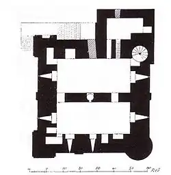The stone-built keeps of the 11th century generally had simple plans, with few rooms and an uncomplicated layout. Rochester's keep bears testament to a developing complexity, and provides an early example of a keep divided into separate areas for the lord and his retinue.[82] The thickness of the walls allowed rooms to be built into them, as can also be seen at the Hedingham Castle's contemporaneous keep, or the slightly later one at Dover. The keep's interior is divided for its entire height by a cross wall running east–west. The ground floor was used for storage, with the three storeys above providing accommodation.[83] The first floor probably contained a hall and great chamber, divided by the cross wall. This level may have been the accommodation of the castle's constable who looked after it during the owner's absence. There is a room called "Gundulf's Chamber" built into the thickness of the wall in the north-west corner; it may well have been the constable's private chamber. The second floor contained the keep's best accommodation and some of its most elaborate decoration. It is 27 feet (8.2 m) high and surrounded by a gallery in its upper half built into the thickness of the walls. The floor also had a chapel measuring about 28 by 15 feet (8.5 by 4.6 m).[84] At some unknown point in the post-medieval period, a fire gutted the keep, leaving it in its present state without floors or a roof. On the second floor, there are openings in the cross wall, broken by a series of Romanesque columns between round-headed arches. The cross wall carried a well shaft, with a well-head at each floor.[85] The third floor had a second chapel and access to the roof, and may have held additional accommodation.[86]