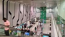 The patterns of the ceiling act as wayfinding elements with directional lines engraved into the design.[29][30] The spacious layout allows ease of movement[30] and improves visual awareness of the platform and concourse.[29] To promote the use of public transportation, the entrances are also integrated with other modes of transportation such as bus, taxis and bicycles.[30] As the site is sloped, the main entrance has ramps to accommodate the height differences. The other entrance (Exit B) features an oval-shaped structure to better resist underground pressure.[29] The entrances were designed to allow future integration with upcoming developments, with provisions for additional underground connections to the station.[30]