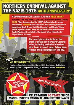In 2018, to mark 40 years since the Rock Against Racism Northern Carnival, the event’s original organisers Bernie Wilcox and Geoff Brown worked with a team within Manchester led by Abigail Ward of the Manchester Digital Music Archive – and sponsored by The Heritage National Lottery Fund and Futura Rec2Rec – to arrange a series of commemoration events. These included a commemoration launch at Manchester Central Library on Saturday 14 July 2018, from 12:00 noon until 5:00pm. The event showed films of the 1970’s anti-racist movement, and included a panel discussion with the original organisers, Bernie Wilcox and Geoff Brown. It showcased the first screening of a new Northern Carnival video – 'The Day It Became Cool to be Anti-Racist' – which featured interviews with those involved and never before seen footage and photographs of the day. An exhibition, We Are Dynamite, ran between Monday 3 – Sunday 23 September 2018, at NIAMOS, Hulme. A live gig, featuring several bands and performers – including Maddy Storm, The Naughtys, Kieran Dobson, Josh Goodard, Golty Farabeau, Patrick T Davis and Young Identity Poets – took place at Night People, Princess Street, Manchester on 14 July 2018.[3] [4] [5] [6] [7] [8] [9] [10] [11] [12] [13] [14] [15] [16] [17] [18]
