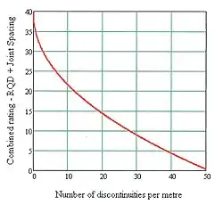 The details for calculating RMR are given by Edumine[4] and provide a series of tables for RMR determination while the latest charts for the same purpose are given in the references and further reading. In particular, the charts enclosed here for the RMR parameters intact rock strength and the combined parameters RQD and discontinuity spacing (represented by the number of discontinuities per meter), show the advantage of using the charts for better accuracy, rather than relying on the tables which show the average ratings for the ranges of each RMR parameter. The lump ratings for each parameter makes it difficult for less experienced personnel to determine the RMR accurately. There are also subjective parameters like roughness and weathering which may pose difficulty in rating assignment. Kundu et al. have proposed continuous functions for each parameter of RMR89 and RMR14 including roughness and weathering.[3] They have also developed a software "QuickRMR" based on the continuous functions to calculate RMR with quantitative inputs.