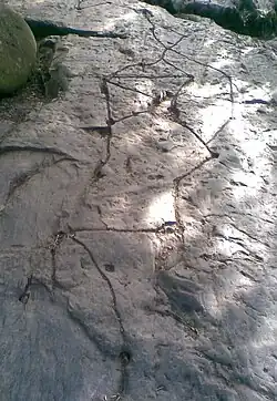 There are two basic patterns of construction. The stone may simply have a series of holes drilled at regular intervals. The ignition was carried between adjacent holes by a trail of black powder over the surface of the stone which was held in place by goose grease. A later construction had the holes linked by shallow grooves, often curved to lengthen the interval between bangs. The black powder was then laid in the grooves and covered with powdered stone to keep it in place.