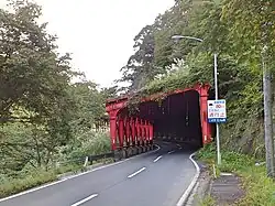 A rock shed is a civil engineering structure used in mountainous areas where rock slides and land slides create highway closure problems. A rock shed is built over a roadway that is in the path of the slide. They are equally used to protect railroads.[1] They are usually designed as a heavy reinforced concrete covering over the road, protecting the surface and vehicles from damage due to the falling rocks with a sloping surface to deflect slip material beyond the road,[2] however an alternative is to include an impact-absorbing layer above the ceiling.[3] A further use of this type of structure may be seen protecting the A4 road; although constructed primarily to alleviate risk from falling rocks from a limestone seam[4] it also serves to protect against objects or persons falling from the Clifton Suspension Bridge[5] where the height differential of approximately 70 metres from the bridge to the bottom of the Avon Gorge would give sufficient kinetic energy to even a relatively small item to cause injury on impact.