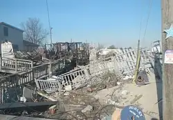 In October 2012, Rockaway was devastated by Hurricane Sandy.[73][74] Many homes, especially in Breezy Point, were damaged or destroyed by high water, or by fires that raged beyond the capability of first responders to contain them. Residents lost everything in their basements, and hundreds of vehicles were ruined. One car caught fire when someone tried to start their vehicle, but residents put the fire out before official help arrived.[75] On August 4, 2013, Senator Charles Schumer announced that the first phase of reconstruction on the beach, completed, would lay the groundwork for a second contract awarded later during the summer of 2013, totally paid for by the federal government through the Hurricane Sandy relief bill.[76]