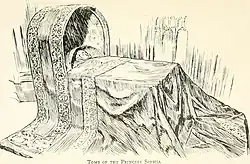 Margaret Houston was Mary's midwife in 1565.[37] In 1567, at Stirling Castle, the "rokkeris" who took turns to rock the cradle of James VI included Jean Oliphant, Lady Kippenross (possibly Jean Stirling),[38] Jean Cromby or Abercrombie, and Catherine Murray, all regarded as members of the lesser nobility,[39] and Christian Stewart (a daughter of John Stewart, Commendator of Coldingham and granddaughter of James V).[40] A canopy of blue "plaiding" was made, either to cover the rockers on duty or for their beds.[41] A bed with a plaiding canopy and cover was provided in Queen's chamber for her maidens of honour.[42] The nurse Helen Littil and Jane Oliphant were given prayer books.[43]