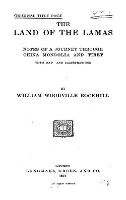 In 1883, Rockhill's wife inherited $70,000 from the death of a cousin, allowing Rockhill to take an unpaid position with the American Legation in Peking.[5] After perfecting his language skills, he was upgraded to a paid position.[2] In the 1880s, he made two extended expeditions into western China, Mongolia and Tibet.[2] He sent an account of his travels to the Smithsonian Institution for publication (as The Land of the Lamas (1891)), and in 1893, he was awarded the Patron's Medal of the Royal Geographical Society.[2] Artifacts from Rockhill's expeditions are in the collections of the Department of Anthropology, National Museum of Natural History, Smithsonian Institution, and archival materials are in their associated archives, the National Anthropological Archives.