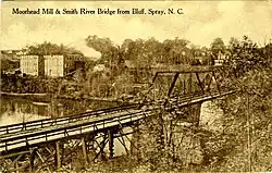 Meanwhile, James Turner Morehead inherited John Motley Morehead's holdings in Leaksville in 1866. He focused on expanding industry in the area, creating the Spray Water Power and Land Company to develop his mills, and supporting the laying of new railroads.[35] By the 1890s, Morehead had grouped his textile holdings into two companies, the Leaksville Cotton and Woolen Mill Company and the Spray Water Power and Land Company, and turned them over to his son-in-law, Frank Mebane.[36] Under Mebane's direction and with the backing of northern investors, the Spray Water Power and Land Company, between 1898 and 1906, built six new cotton mills and created a warehouse company.[36][37] The expansion of the textile industry led to the growth of two new mill communities in the vicinity of Leaksville, Spray and Draper.[38][22] The three communities collectively became known as the "Tri-Cities".[39] One of Mebane's holdings, the Spray Cotton Mills company, was sold to a private owner in 1897.[37] Most of the rest were taken over by Marshall Field & Company in 1911 and 1912 after Mebane overextended his credit.[36][38]
