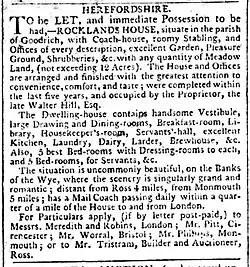 In the 1700s the house was named Yuxton (sometimes it was called Yoxton). It was owned by the Hill family who were wealthy landowners in Llangarren and Goodrich. The map of 1794 shows the older house. It is recorded as being the property of Thomas Hill in the early 1700s[2] and it then passed to his son Guy Hill and then to Walter Hill, who made the major additions to the core of the house and renamed it Rocklands House. This event was described in a book of 1800 in the following terms: