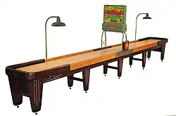 Rock-Ola was also the maker of shuffleboard tables from 1948 to 1950. Considered by collectors the Cadillac of shuffleboards due to their Art Deco styling with curving woodwork and much chrome, they are highly sought after by players.