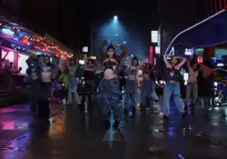 The music video's aesthetic was described as "cyberpunk grunge", with the neon-lit streets of the Yaowarat district mirroring futuristic visuals typically associated with Japan.[20][51] It begins with Lisa standing solo in the center of the brightly-lit street while wearing a "criss-cross bra top, star-shaped earrings, and black moto bottoms styled with layers of silver-stud belts." She then switches scenes to a room with orange walls backdropped by dozens of dancers, now wearing a graphic black-and-white halter top with baggy jeans from Dion Lee’s fall 2024 runway show. The video transitions back to the streets of Bangkok for the chorus, where Lisa dances in low-rise bottoms with a star-shaped black bandeau top, with shimmery eye makeup and blue streaks in her hair. For the song's bridge and ending, Lisa debuts a new futuristic look from Dawei Studio and performs high-energy choreography while wearing a "silver foil corset top and matching parachute pants" in a monochrome white room.[56]