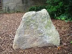 Stone marker on corner of Vinson Street and Maryland Avenue, placed there in 1803 when Rockville's streets were laid out. "BR" stands for "Beginning of Rockville".
