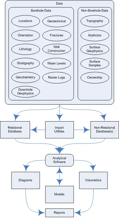 The raw dataset that are used for industrial mineral deposit modeling can be classified into two major types: borehole and non-borehole data. The management of borehole data is very different from non-borehole data. Specifically, borehole data requires a relational database management system (e.g. Access, FileMaker, SQL, Oracle,) whereas non-borehole data (with the exception of land ownership) can be handled with simple “flat” file managers (e.g. Microsoft Excel, Lotus 1-2-3).