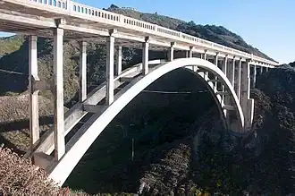 Rocky Creek Bridge is a reinforced concrete open-spandrel arch bridge on the Big Sur coast of California, featuring a reinforced-concrete, open-spandrel, fixed, parabolic-arch, a decorative cantilevered walkway, and reinforced-concrete railings in an arched-window design. It is located in Monterey County, on State Route 1 (Cabrillo Highway) about 12 miles (19 km) south of the city of Carmel, and about a mile north of the more famous Bixby Creek Bridge.