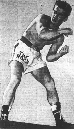 Thomas Rocco Barbella (January 1, 1919[1] – May 22, 1990), better known as Rocky Graziano, was an American professional boxer and actor who held the World Middleweight title.[2] Graziano is considered one of the greatest knockout artists in boxing history, often displaying the capacity to take his opponent out with a single punch. He was ranked 23rd on The Ring magazine list of the greatest punchers of all time. He fought many of the best middleweights of the era including Sugar Ray Robinson. He was the subject of the 1956 film, Somebody Up There Likes Me, based on his 1955 autobiography, starring Paul Newman as Graziano.