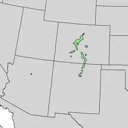 The Colorado bristlecone grows in three western US states, Colorado, New Mexico, and Arizona.[28] The Rocky Mountain bristle cone reaches its northern limit at approximately 40 degrees north latitude.[22] They are widely distributed in the Southern Rocky Mountains, but are limited to small areas within its range.[29] The elevation range where it grows is widest, from 2,100 to 4,000 meters (6,900 to 13,100 ft), in the state of Colorado. The Arizona population is only found above 2900 m and only as high as 3700 m. In New Mexico the trees start at a similarly high elevation of 3000 m and have the same maximum as in Arizona.[30]