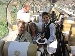 Operating on all routes except the Rockies to the Red Rocks, Rocky Mountaineer's GoldLeaf service is a custom-designed, bi-level, glass-domed coach with full-length windows and reclining seats that can be rotated to accommodate groups of four. Guests are offered hot meals prepared on board the train, served to them in the lower level dining car.[18][19]