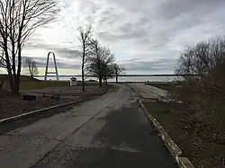 Rocky Point is a passive use area, with most of the former amusement park now open space.[13] A few structures remain from the amusement park, including the 1906 Circle Swing ride tower, the upper and lower stations and support towers from the Skyliner gondola ride, ruins of an old water tank, and a large arch by the entrance.[14][15] The arch was one of 11 “Peace Through Understanding” arches at the 1964 World's Fair in Flushing, Queens, New York; it was moved to Rocky Point in 1966 and underwent restoration in 2016.[16][17][18][19] In the summer, the park screens movies on its lawn and hosts a 5K run.[20][21] In 2017 and 2018, the state park hosted Food Truck Nights. A large public fishing pier was opened in July 2020,[22] which is the only deep-water fishing pier in the bay.[23]