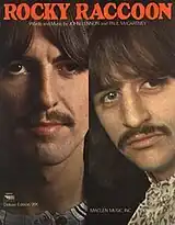 The song, a country-style ballad, is titled from the character's name, which was originally "Rocky Sassoon", but McCartney changed it to "Rocky Raccoon" because he thought "it sounded more like a cowboy".[5] Former 13th Floor Elevators drummer Danny Thomas claims the name "Rocky" was inspired by Roky Erickson, the American rock band's then-vocalist and -guitarist.[6] According to Beatles historian Kenneth Womack, McCartney drew his inspiration for the song from Robert W. Service's poem "The Shooting of Dan McGrew".[7] Canadian photographer and filmmaker Paul Saltzman, author of The Beatles in Rishikesh and The Beatles in India, has expressed the belief that Paul McCartney based the lyrics for "Rocky Raccoon" on Saltzman's description to him in Rishikesh of his girlfriend having recently left him for another man. The Old West-style honky-tonk piano was played by producer George Martin.[8] "Rocky Raccoon" is also the last Beatles song to feature John Lennon's harmonica playing.