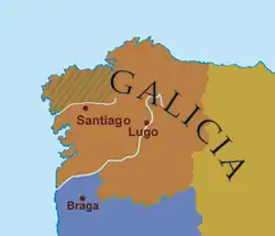 Among the Galician castles (castra) which the Historia compostellana names Rodrigo as holding are San Jorge, Traba (from which his family took its name), and a place called Ferraria (today Ferreira, a parish of Coristanco).[5][6] These three castra are elsewhere called castellis by Alfonso VII in a donation to the Cathedral of Santiago in 1127, where they also appear clumped together. In the charter of donation Rodrigo is twice named "Count Rodrigo de Traba" (Comes Rudericus de Traua), a name used again in a similar royal donation in 1131. These are the only instances in contemporary documents of Rodrigo using "Traba" as part of his name.[7] Sometime before 5 December 1135 Rodrigo was granted the tenencia (fief) of the Limia in Galicia, which he continued to govern down to at least 13 March 1156, possibly until his death. By 31 January 1155 he had also received the important Galician tenencia of Monterroso, where he can be seen ruling as late as 1 June 1157, and probably until his death.[1] In one of Alfonso VII's last donations to the Cathedral of Santiago, in 1155, Rodrigo styled himself "Count Rodrigo Pérez of Galicia", the last apparent use of the title "Count of Galicia".[8] One document dated 13 February 1147, but corrected to 1148, refers to his holding Salamanca, an important Leonese city, jointly with Ponce Giraldo de Cabrera, but this is the only citation of such a holding.[9]