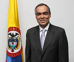 Rodrigo Rivera Salazar (born 20 April 1963)[1] is a Colombian politician. A lawyer, diplomat, professor and journalist, Rivera served in the Congress first as a Member of the Chamber of Representatives for two terms from 1990 to 1998,[2] and then as Senator of Colombia for two terms from 1998 to 2006,[2] when he retired from Congress to run, ultimately unsuccessfully, for the 2006 Liberal presidential nomination. In 2010, Rivera was appointed Minister of National Defence of Colombia by President Juan Manuel Santos Calderón and served until his resignation the following year.