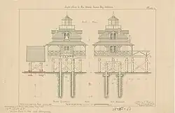 The Roe Island Light was built on Roe Island, in the Suisun Bay across from Port Chicago, 33 miles (53 km) inland from the Golden Gate and five miles (8 km) east of Benicia. Congress approved the construction of the lighthouse in 1888, giving the project 10,000 dollars.[2] Beginning on February 16, 1890, a fixed white light was installed, and ran from that day forward.[3] The lighthouse was featured in the San Francisco Call on April 19, 1896,[4] where the author states that the lighthouse's platform was built fifteen feet above high tide, with the lighthouse being the center of the structure, with two rooms also contained in the structure. The lenses of the lighthouse were manufactured in Paris, France by Sautter & Co. In the 1900s, a second dwelling similar to the lighthouse without the lantern was built adjacent to the lighthouse.