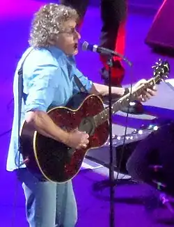 After 1999, it became common for Daltrey to play guitar during both the Who and solo shows. He played a Versoul Buxom 6 handmade acoustic guitar on the Who's 2002 tour.[66] Daltrey owns a Gibson Everly Brothers Flattop acoustic guitar which he played on the Who and solo tours in the late first decade of the 21st century.[67] On his 2009 tour, he played Pete Townshend's "Blue, Red and Grey" on an Ashbury cutaway tenor EQ ukulele.[68]