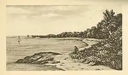 Accordingly, Williams and Thomas Angell crossed the Seekonk River in search of a new location suitable for settlement. Upon reaching the shore, Williams and Angell were met by Narragansett people who greeted them with the words "What cheer, Netop" (transl. Hello, friend). The settlers then continued eastward along the Providence River, where they encountered a cove and freshwater spring. Finding the area suitable for settlement, Williams acquired the tract from sachems Canonicus and Miantonomi.[25] Here, Williams and his followers established a new, permanent settlement, convinced that divine providence had brought them there. They named it Providence Plantations.[26]