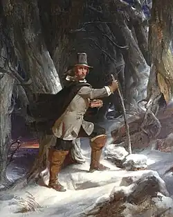Finally, the General Court tried Williams in October 1635 and convicted him of sedition and heresy. They declared that he was spreading "diverse, new, and dangerous opinions"[24] and ordered that he be banished. The execution of the order was delayed because Williams was ill and winter was approaching, so he was allowed to stay temporarily, provided that he ceased publicly teaching his opinions. He did not comply with this demand, and the sheriff came in January 1636, only to discover that he had slipped away three days earlier during a blizzard. He traveled 55 miles on foot through the deep snow, from Salem to Raynham, Massachusetts, where the local Wampanoags offered him shelter at their winter camp. Sachem Massasoit hosted Williams there for the three months until spring.