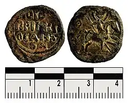 The first type bore the image of the Mother of God Orans, standing full-height. The second type bore the image of the Miracle of Saint George and the Dragon. It is quite possible that it was minted after Roger's great victory at the Battle of Tell Danith. Prince Roger was in fact the first ruler in the Christian world to depict the Miracle of Saint George and the Dragon on his coinage.[7]