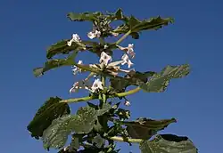 The calyx has five sepals (petals), the corolla is tubular and funnel-shaped. The stamens are four in number, and do not project beyond the border of the corolla. The fruit (or seed capsule) is almost nut-like, opens towards the point. It has 4 - 8 spines, and appears to be 4-6 celled. The cells having either an indefinite number or only solitary seeds.[2]