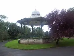 The park's bandstand is octagonal, cast-iron with a wood base and a metal-covered roof.
