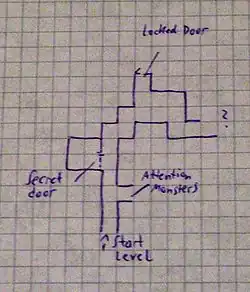 Example of a dungeon map drawn by hand on graph paper. This practice was common among players of early role-playing games, such as early titles in the Wizardry and Might and Magic series. Later on, games of this type started featuring automaps.
