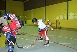 Inline hockey or roller hockey is a variant of hockey played on a hard, smooth surface, with players using inline skates to move and ice hockey sticks to shoot a hard, plastic puck into their opponent's goal to score points.[1] The sport is a very fast-paced and free-flowing game and is considered a contact sport, but body checking is prohibited. There are five players including the goalkeeper from each team on the rink at a time, while teams normally consist of 16 players.[2] There are professional leagues, one of which is the Professional Inline Hockey Association.