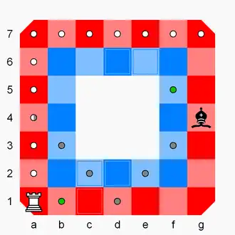 In general, forward movement means clockwise direction around the board; backward movement means counterclockwise direction. The squares comprising the board's inner and outer perimeters are called rings. The ring a rook or pawn currently stands on determines its orthogonal forward direction, and for a rook, its orthogonal backward direction. An orthogonal rook move in a direction immediately off its ring is called sideways movement.