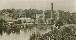 The village of Salmon Falls was founded in 1823 by a group of local investors led by James Rundlet of Portsmouth, who on June 17, 1822, incorporated the Salmon Falls Manufacturing Company to manufacture woolen cloth using the power of the Salmon Falls River, a Piscataqua River tributary.[7] After an 1834 fire destroyed the first factory built there, the company's Portsmouth-based investors built a new factory for cotton manufacturing, eventually selling the corporation to their Boston-based cotton broker Mason and Lawrence in the 1840s. As part of their expansion, the town was laid out in an easy-to-navigate grid plan, with the three-story boarding houses and an adjoining mill building made of brick to withstand fires. Two-story brick double houses were also built to accommodate the families of the overseers.[7] The town thrived into the first decades of the 20th century and eventually became home to many immigrant families whose forebears came to work in the mills. Although the town planners originally forbade the mill workers to drink alcohol and required that they attend church on Sunday, during Prohibition, its proximity to temperate Maine and the Boston & Maine Railroad line led to the establishment of numerous bars and a relatively short-lived but racy reputation for free-flowing liquor.