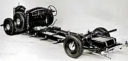 Rolls-Royce broke with their earlier decision to cease production of the series of "big" Rolls-Royce Phantoms after the end of World War II.[2] The Phantom IV chassis differed from those of the shorter, production post-War models, the Silver Wraith and the Bentley Mark VI; apart from a larger size and an engine with increased capacity and power, they have an additional cross-member at the centre of the cruciform bracing and 10-stud road wheel mountings.[3]