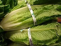 Romaine or cos lettuce (Lactuca sativa L. var. longifolia) is a variety of lettuce that grows in a tall head of sturdy dark green leaves with firm ribs down their centers. Unlike most lettuces, it is tolerant of heat. In North America, romaine is often sold as whole heads or as "hearts" that have had the outer leaves removed and are often packaged together.