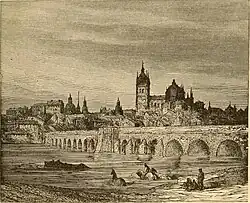 The Roman bridge of Salamanca (Spanish: Puente romano de Salamanca), also known as Puente Mayor del Tormes and as Puente Prinçipal (main bridge), is a Roman bridge crossing the Tormes River in the city of Salamanca, Castile and León, Spain.[1] The bridge originally dates to the period of Roman occupation of the Iberian Peninsula, being built between 27BCE and 79CE and gave access to the southern part of the city. The bridge is part of the historic road known as the Vía de la Plata, passing between Mérida and Astorga. The bridge has had strategic, economic and cultural value to the region. The bridge has been rebuilt a number of times since its original construction, with the section on the right bank, to the city of Salamanca, retaining the majority of the original Roman construction.[2][3]