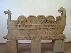 There is suggestive archaeological evidence that Roman traders were present in Southeast Asia, which was roughly mapped out by Ptolemy in his Geography where he labelled the land bordering the Magnus Sinus (i.e., the Gulf of Thailand and South China Sea) as the Sinae.[13] Their port city of "Cattigara", lying beyond the Golden Chersonese (Malay Peninsula) where a Greek sailor named Alexander allegedly visited, was quite possibly the ancient settlement at Oc Eo, Vietnam, where Roman artefacts from the Antonine period such as medallions from the reigns of Antoninus Pius (r. 138–161) and Marcus Aurelius (r. 161–180) have been found.[14] An event recorded in the Chinese Weilue and Book of Later Han for the year 166 seems directly connected to this activity, since these texts claim that an embassy from "Daqin" (i.e., the Roman Empire) sent by their ruler "An Dun" (Chinese: 安敦; i.e., either Antoninus Pius or Marcus Aurelius) landed in the southern province of Jiaozhi (i.e., northern Vietnam) and presented tributary gifts to the Chinese ruler Emperor Huan of Han.[15] Rafe de Crespigny and Warwick Ball contend that these were most likely Roman merchants, not official diplomats sent by Marcus Aurelius (given the absence of this event in Roman sources).[16][17]