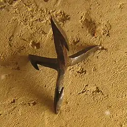 A tribulus (caltrop) was a weapon made up of four sharp nails or spines arranged in such a manner that one of them always pointed upward from a stable base (for example, a tetrahedron). Caltrops served to slow down the advance of horses, war elephants, and human troops. It was said to be particularly effective against the soft feet of camels.[32]