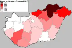 Romani people in Hungary (also known as roma or Romani Hungarians; Hungarian: magyarországi romák, magyar cigányok) are Hungarian citizens of Romani descent. According to the 2011 census, they comprise 3.18% of the total population, which alone makes them the largest minority in the country,[21] although various estimations have put the number of Romani people as high as 8.8% of the total population.[22][6][23] They are sometimes referred as Hungarian Gypsies, but that is sometimes considered to be a racial slur.[24][25][26]