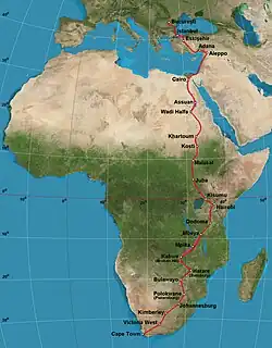 Then they planned the itinerary: Bucharest – Istanbul – Eskişehir – Konya – Adana – Aleppo – Damascus – Gaza – Cairo – Assiut – Assuan – Wadi Halfa – Atbara – Khartum – Malakal – Juba – Entebbe – Nairobi – Dodoma – Mbeya – Mpika – Broken Hill – Salisbury – Bulawayo – Pietersburg – Johannesburg – Kimberley – Victoria West – Cape Town and return.[42]