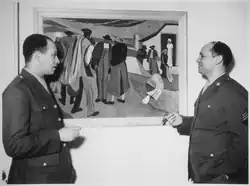 In 1942, Bearden produced Factory Workers (gouache on casein on brown kraft paper mounted on board), which was commissioned by Forbes magazine to accompany an article titled The Negro's War.[41] The article "examined the social and financial costs of racial discrimination during wartime and advocated for full integration of the American workplace."[42] Factory Workers and its companion piece Folk Musicians serve as prime examples of the influence that Mexican muralists played in Bearden's early work.[41][42]