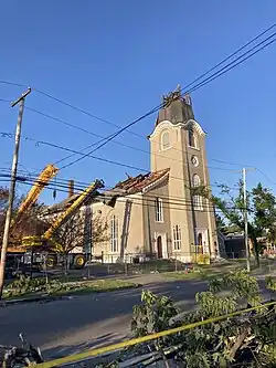On July 16, 2024, a high-end EF2 tornado struck Rome, causing widespread power outages and property damage.[21] The tornado touched down just north of the Erie Canal, passed through the center of Rome, and lifted up on the far side of Griffiss Air Force Base. A decommissioned B-52 on display near the airport was moved nearly 25 feet off its platform. Among other heavily damaged structures, two churches were heavily damaged, losing their steeples and having their roofs collapse. Many brick structures collapsed. States of emergency were declared by the city, county, and state governments.[22]