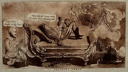 Later[2] he appeared in Romeo and Juliet in the part of Romeo – in a costume of his own design. The costume had a flowing, sky-blue cloak with sequins, red pantaloons, a vest of white muslin, a large cravat, and a plumed "opera hat," according to Captain Rees Howell Gronow – not to mention dozens of diamonds – which was hardly suitable for the part.[3] The garments were too small for Coates and caused him to move stiffly, and at some point, the seat of his pants split open. The audience roared with laughter.
